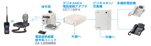 ソリューションシステムのひとつ。 移動するクルマや携帯型無線機からオフィスの内線電話に直接アクセス。 |